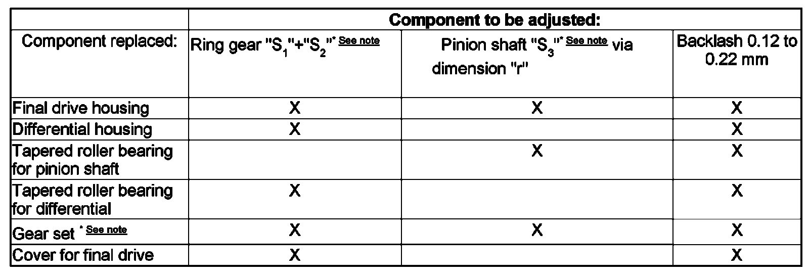 ^ When working on the transmission, pinion shaft or gear set only need to be adjusted if components were replaced which directly influence the final drive. Note the follow table to prevent unnecessary adjustments:
