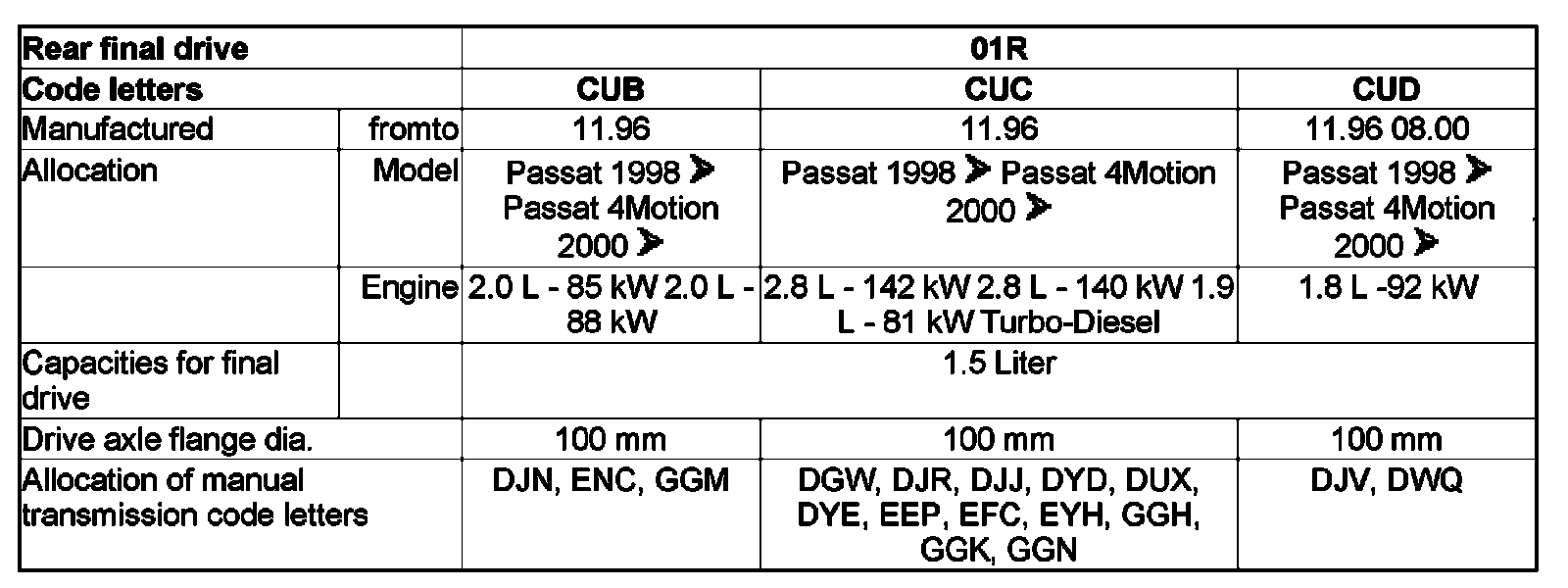 Code letters, assembly application, ratios, capacities, 01A, 5 SPD. M/T (AWD)