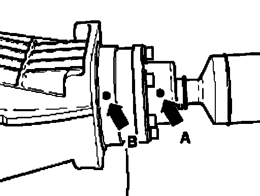 ^ Check whether there is a factory marking (color marking) on driveshaft. If not, mark location of driveshaft flange - arrow A - to rear final drive - arrow B - with color.