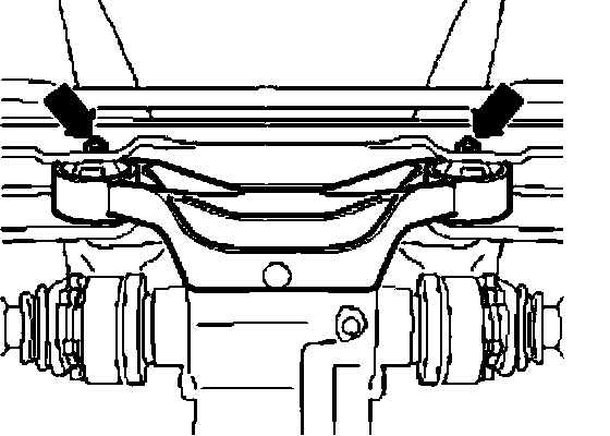^ Remove nuts - arrows - from bonded rubber bushings at rear crossmember. The bolts remain inserted.