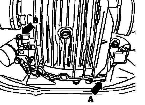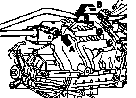 ^ Disconnect connector for back-up lights - arrow B -. Disconnect all other electrical connections and ground wires from transmission and from engine/transmission mounting bolts.