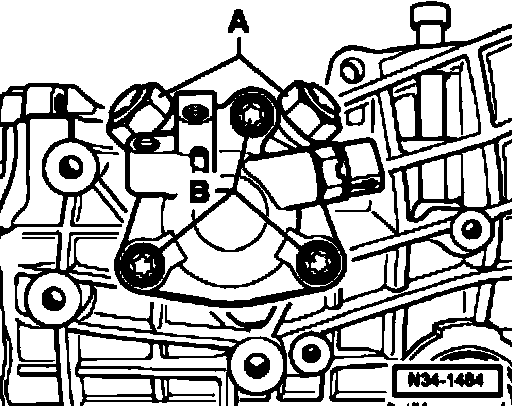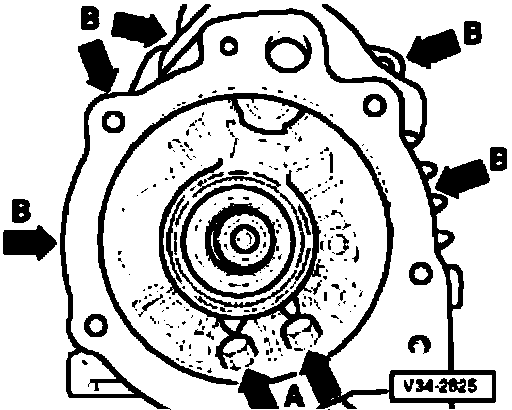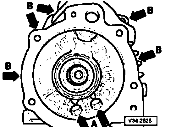 - Install bolts -B- (Qty. 3) with sealing paste AMV 188 001 02 and tighten to prescribed torque.
