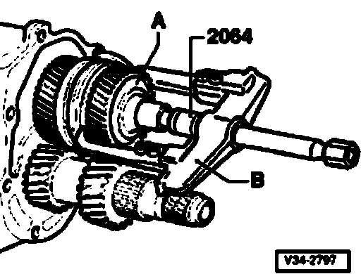 - Push 1st and 2nd gear yoke -A- onto selector rod and secure with circlips.