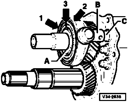 - Remove 5th gear shims -B-, note thickness and redetermine if necessary.