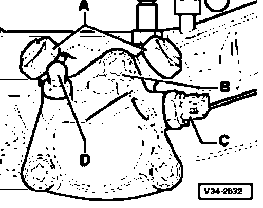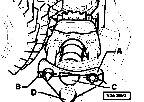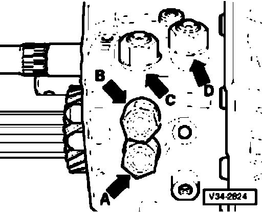 - Remove hex head bolt -D-, take off spring clip -B- and retaining plate -A- and pull out reverse gear wheel axle -C-.