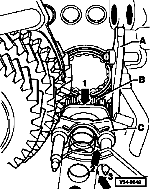 - Mark locking collar for 5th and 6th gear (arrow -1-) and synchronizing hub -A- (paired) in installed position (arrow -3-).