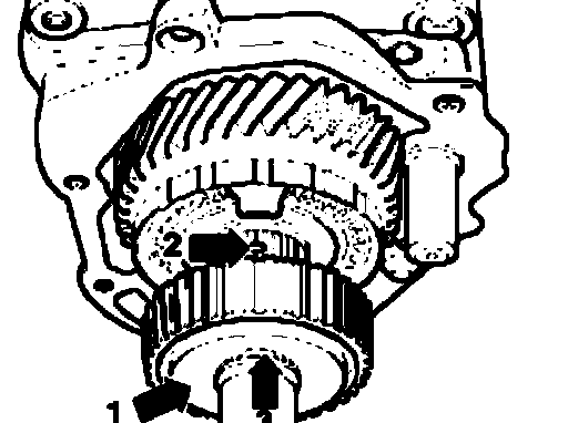 - Oil drilling in input shaft (arrow -2-) and oil groove of synchronizing hub (arrow -3-) align.