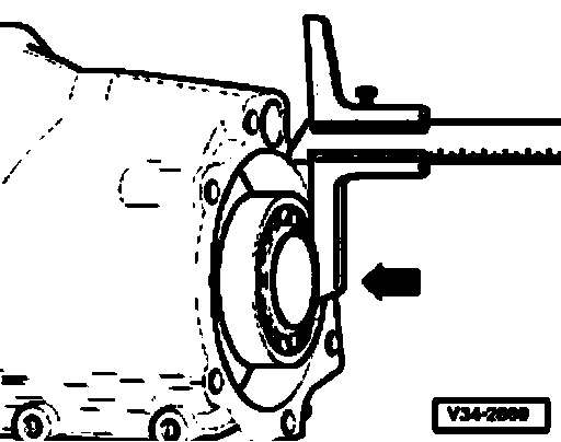 - Press Torsen differential in direction of arrow, measuring distance between upper edge of bolted end cover and front edge of outer ball bearing race of Torsen differential.