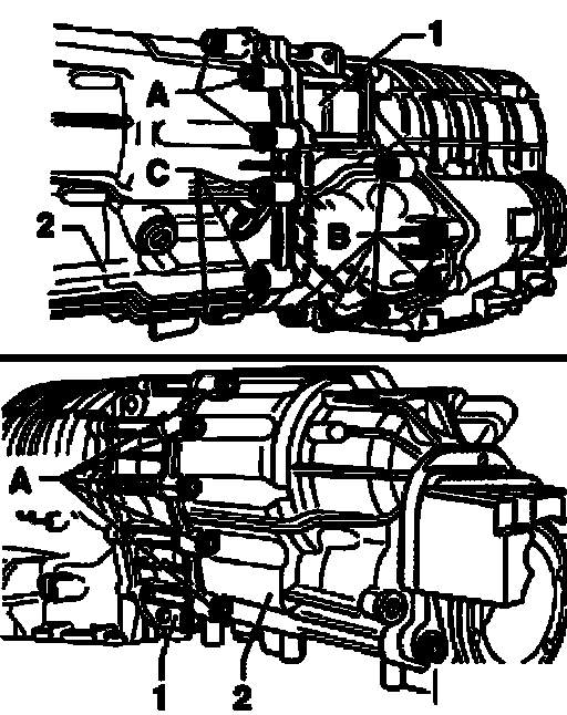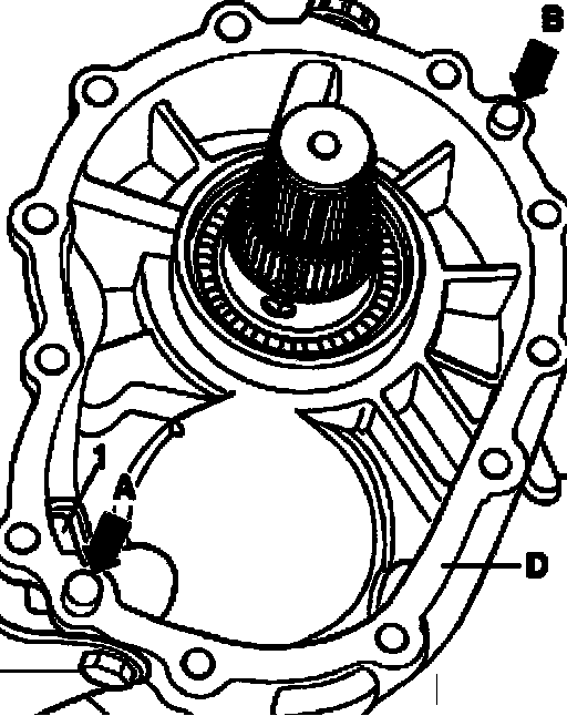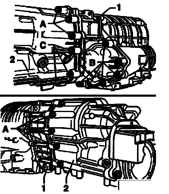 ^ Loosen mounting bolts - A - and - C - for transfer housing - 2 - in diagonal sequence and remove.