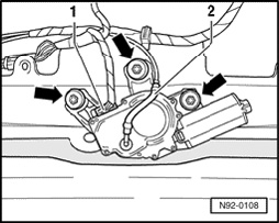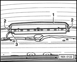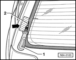 - Insert guide needle - 2 - from Window removing kit V.A.G 1755 using handle - 1 - under sealing lip and push through adhesive bead (use side areas, wear gloves).