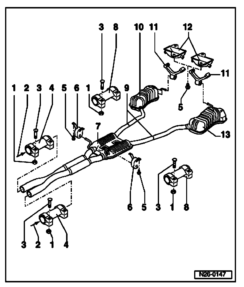 - As standard, center and rear mufflers are installed as a single component. In cases of repair, center and rear muffler are supplied individually and with a double clamp for connecting.