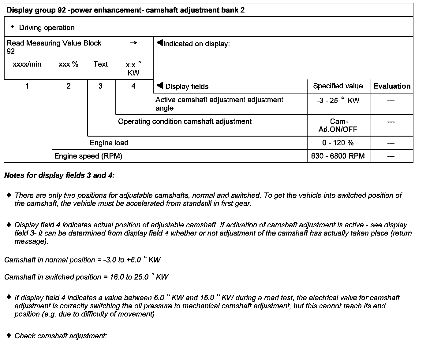 Display group 92 -power enhancement- camshaft adjustment bank 2