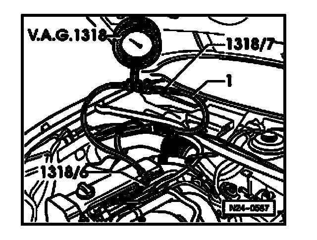- Connect pressure gauge (VAG1318 using adapters VAG1318/6 and 1318/7) to supply line -1- and fuel distributor.