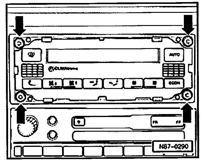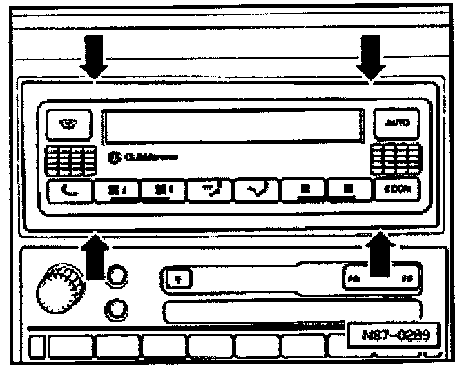 - Using a screwdriver with a protected tip, carefully unclip control head trim at locations indicated by -arrows-.