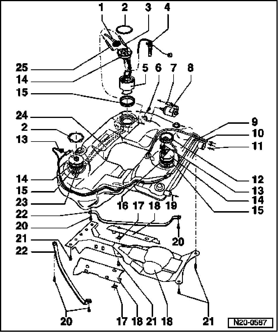NOTE: After installing Fuel Pump (FP) flange, check whether supply, return and vent lines are still clipped in at fuel tank.