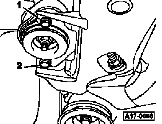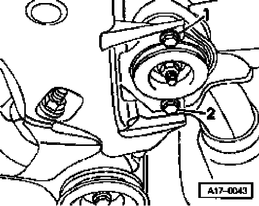 ^ Loosen rear bolt -2- of left-hand transmission mounting a few turns. Remove front bolt -1- of left-hand transmission mounting.