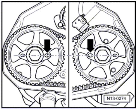 - Check the position of the camshaft gears. The large holes - arrows - on the securing plates must align on the inside.