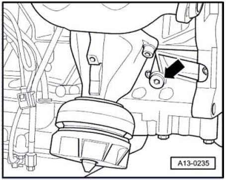 - Remove the locking bolt from the cylinder block - arrow -. The TDC hole for the crankshaft must be visible or felt inside the hole for the locking bolt.