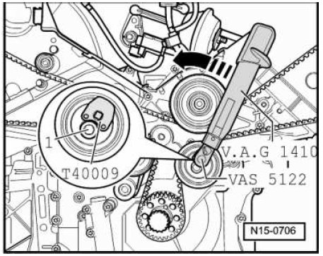 - Pretension the loosened eccentric roller using the (VAG 1410) with the (VAS 5122) connected with the (T40009) counterclockwise - arrow - to 4 Nm.