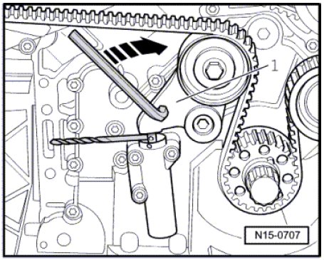 - Turn the tensioner lever - 1 - in the - direction of arrow - using a hex wrench. Place a 7 mm drill bit between the tensioner lever and tensioner element.