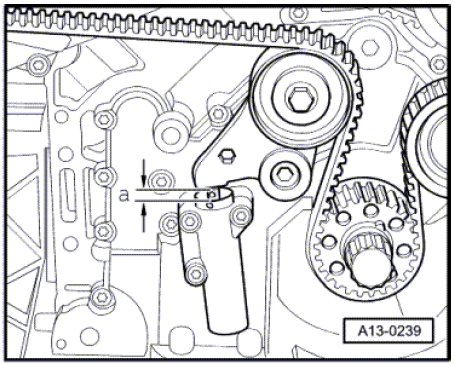 - Rotate the crankshaft twice in direction of engine rotation and check the adjustment dimension - a -. Specified value: 5 mm.