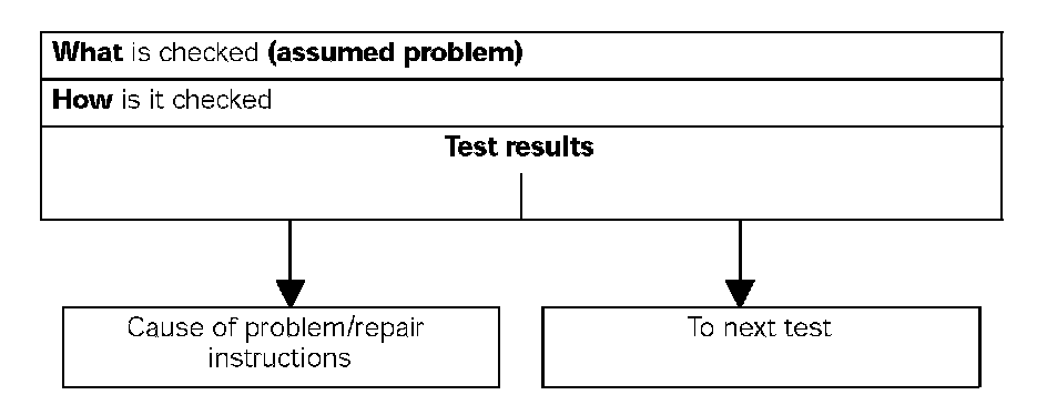 Starting with the reported problem, troubleshooting procedures show step-by-step what is checked and how it is checked in order to find the problem in the quickest and most reliable way. If several causes (of a problem) are possible in one system, a test procedure is used for diagnosis.