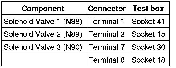 - Check resistances of solenoid valves at connector to the solenoid valves: