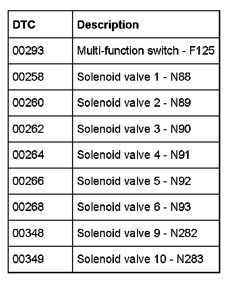 1. Multi-function switch implausible signal or solenoid valve (N88, N89, N90, N91, N92, N93, N282, N283) disruption to positive.