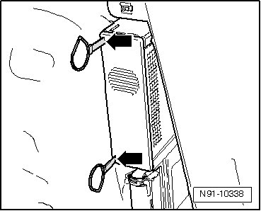 - Insert Radio Removal Tools (T10057) into release openings - arrows - until they engage.