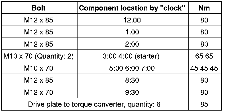 Drive plate to torque converter, quantity: 6 = 85 Nm.