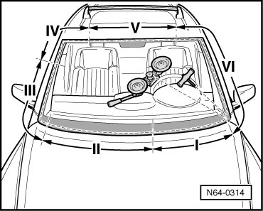 - Push cutting cord end through adhesive sealant into vehicle interior using awl (from (V.A.G 1474 A)).