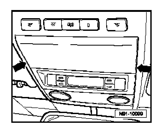 - Using appropriate screwdriver, carefully unclip rear portion of roof console trim from areas indicated with -arrows-.