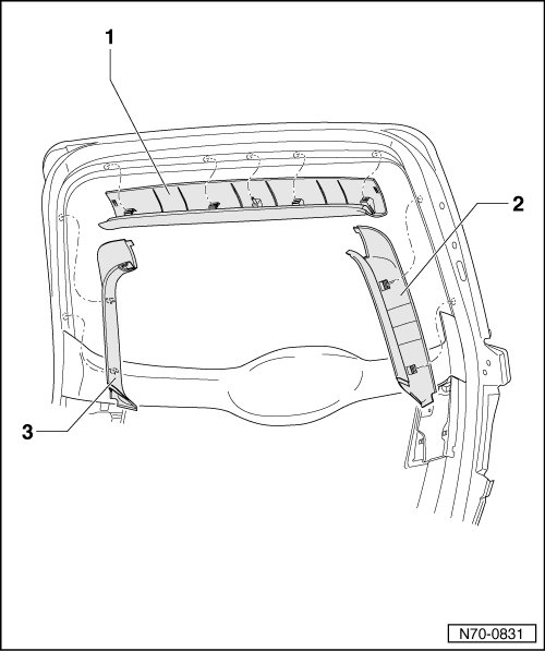 - Pull upper window frame trim - 1 - in direction opposite of travel out of mountings in tailgate.