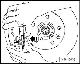 - Push retaining spring in the direction of - arrow A - first and then into hole of brake caliper at the same time direction of - arrow B