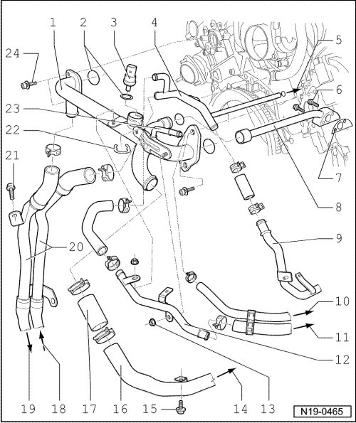 • With junction to heat exchanger for heater, expansion tank and upper coolant hose.