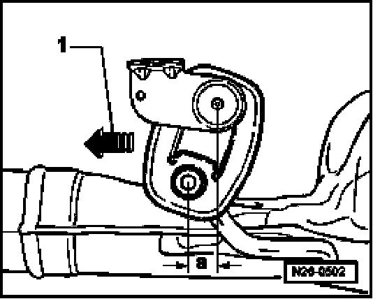 - Press exhaust system in direction of travel (arrow -1-) and tighten double clamps tightly until dimension -a- at suspensions is reached.