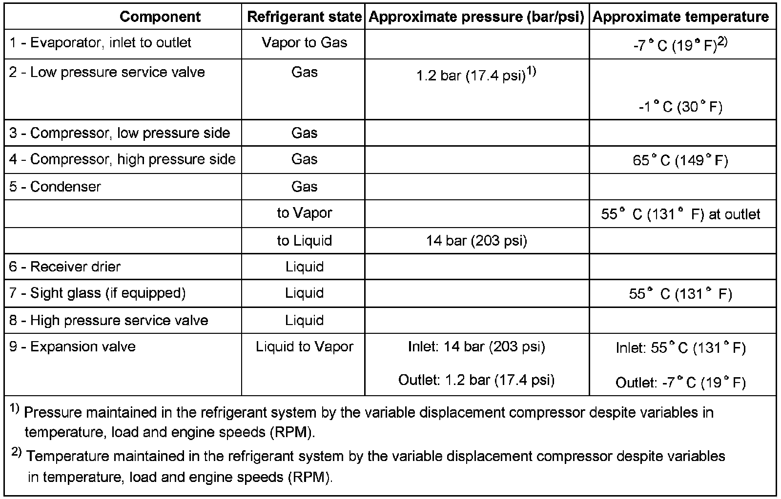 The pressures and temperatures in the A/C system will vary depending on engine speed (RPM), coolant fan speed, engine coolant temperature, compressor regulation, outside temperature, humidity, etc.