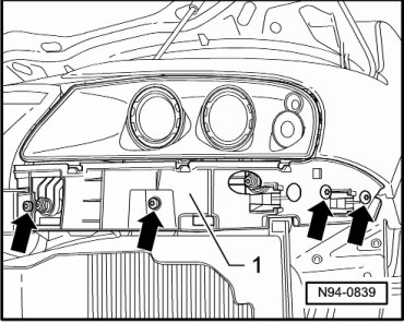 - Loosen the two front mounting bolts - arrows - far enough until headlamp mount with headlamp can be moved back and forth lightly in adjustment bushings.