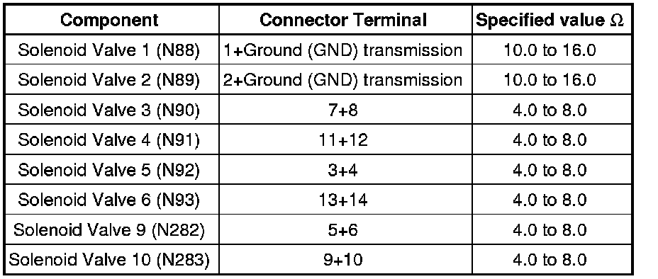 - Check resistances of solenoid valves at connector to the solenoid valves: