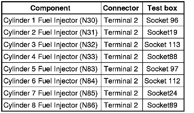 - Disconnect harness connector of fuel injectors (Cylinder 1 Fuel Injector (N30) to Cylinder 4 Fuel Injector (N33), Cylinder 5 Fuel Injector (N83)- to Cylinder 8 Fuel Injector (N86)), cylinder bank 1 and 2.