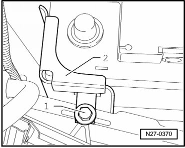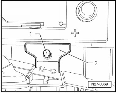 - Remove bolt - 1 - and battery hold-down bracket - 2 -.