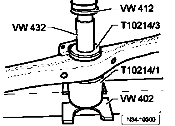 Do not press the bonded rubber bushing deeper in the transmission support than the height of the tube 3296. If necessary, use the base block VW 441 to press.