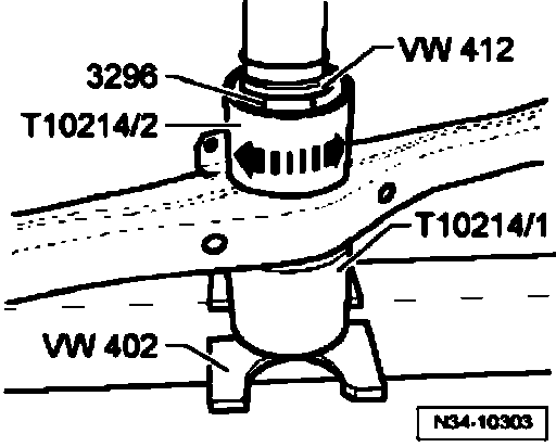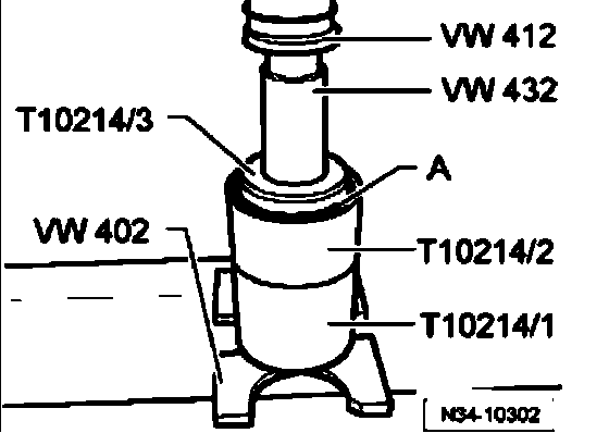 - Press new bushing -A- with assembly fixture T10214/3 into guide sleeve T10214/2 until fixture T10214/3 is against sleeve T10214/2.