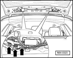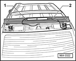 - Raise rear spoiler slightly and separate brake light connector -1- and hose connection -2- for spray nozzle.
