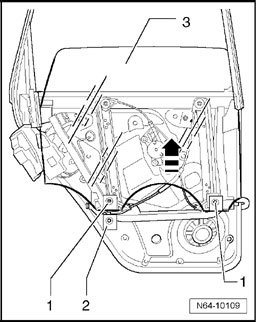 - Lift door window -3- out of securing elements -2- and pull the door window - 3 downward in - direction of arrow - out of window guide.