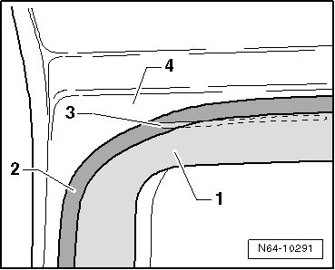 - If the laser weld seam - 3 - on the sheet metal flange - 4 - is not covered by the adhesive bead - 1 -, coat the weld seam - 3 - with glass/paint primer D 009 200 02 - 3 - and fill the weld seam with window adhesive DH 009 100 03 - 1 -.