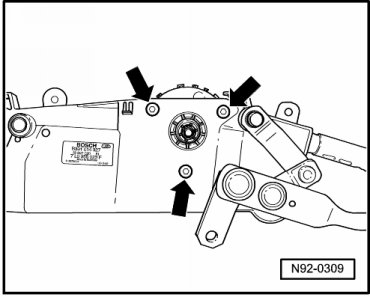 - Insert Windshield Wiper Motor (V) into wiper frame and secure it with mounting bolts - arrows -.
