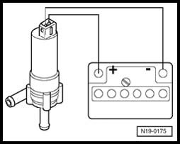 - Connect contacts of after-run coolant pump V51 to battery, using adapter cables from connector test set V.A.G 1594C. After-Run Coolant Pump V51 must start running.