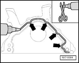 ^ The sealing compound bead must not be thicker, otherwise excess sealing compound could enter the oil pan and may block the oil suction pipe strainer. Likewise, it could drip onto the sealing surface of the crankshaft seal.
