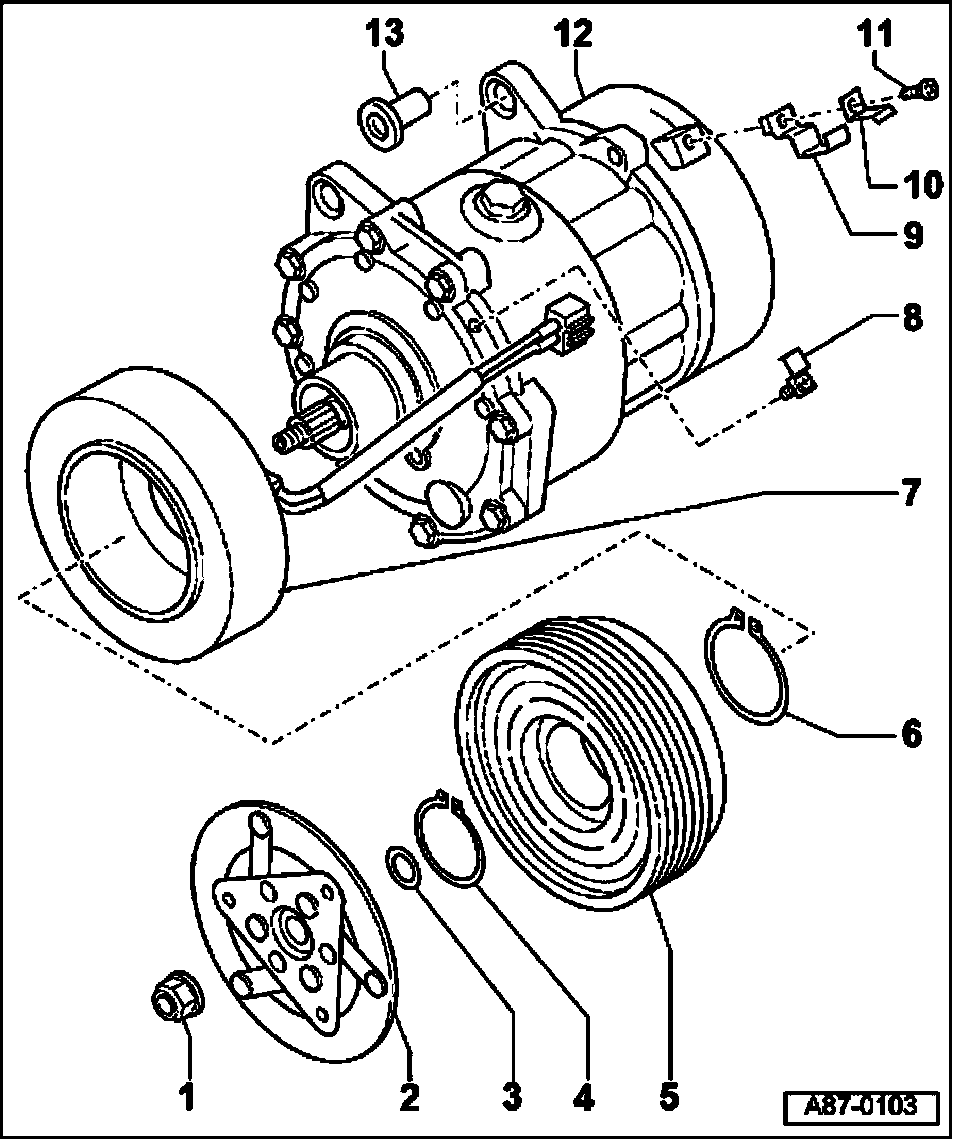 NOTE: A thermo-fuse integrated into the clutch coil protects the A/C clutch in the event of overheating (e.g.: due to a binding compressor) The clutch coil circuit is interrupted.